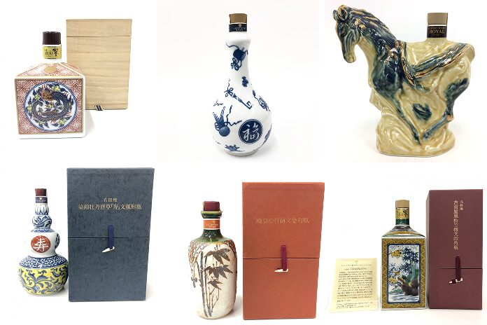 終売したニッカやサントリーの古い陶器ボトル。 日本の伝統工芸品のようなボトルデザインは、外国人ゲストへの「おもてなし」に最適です。